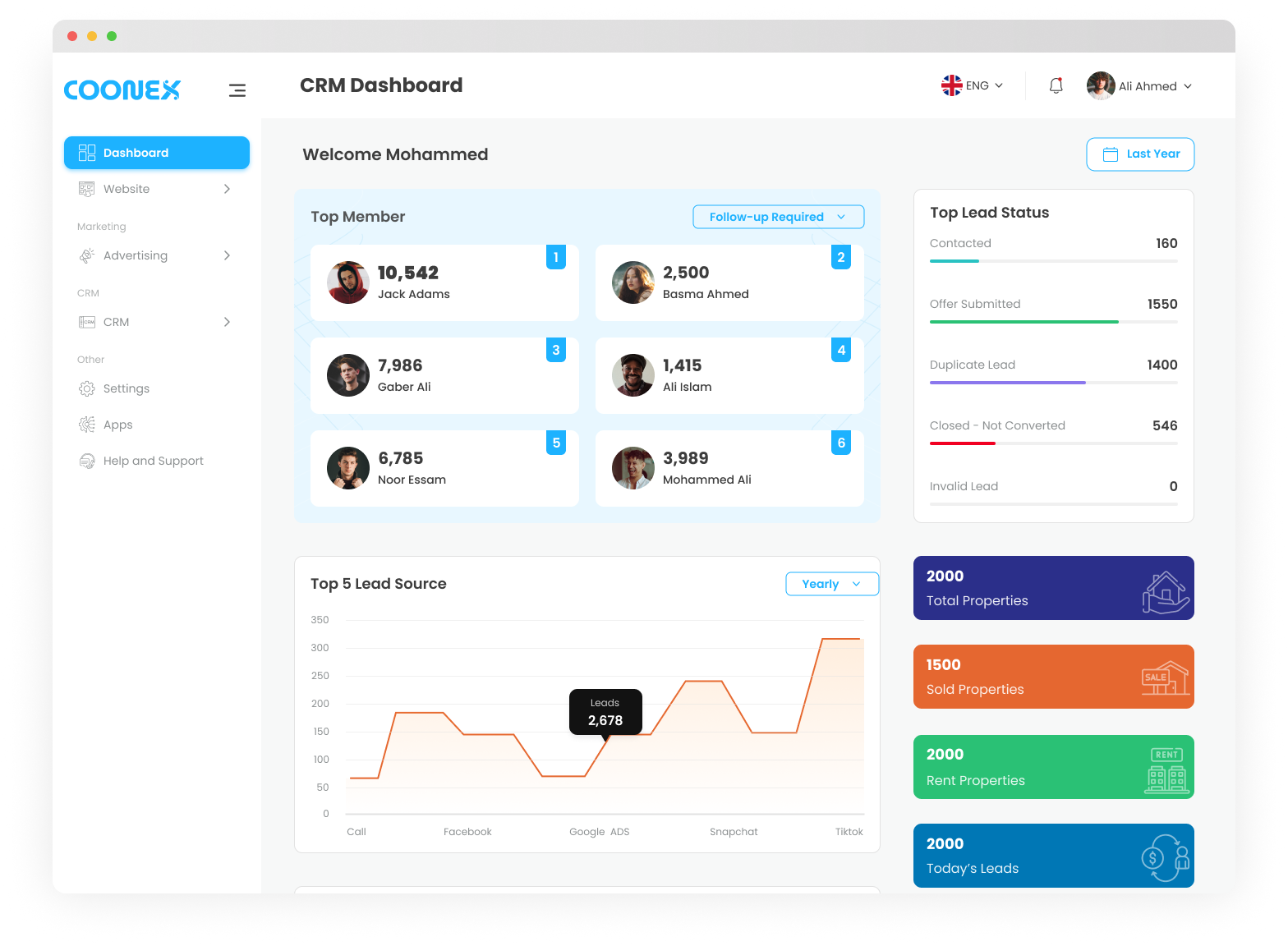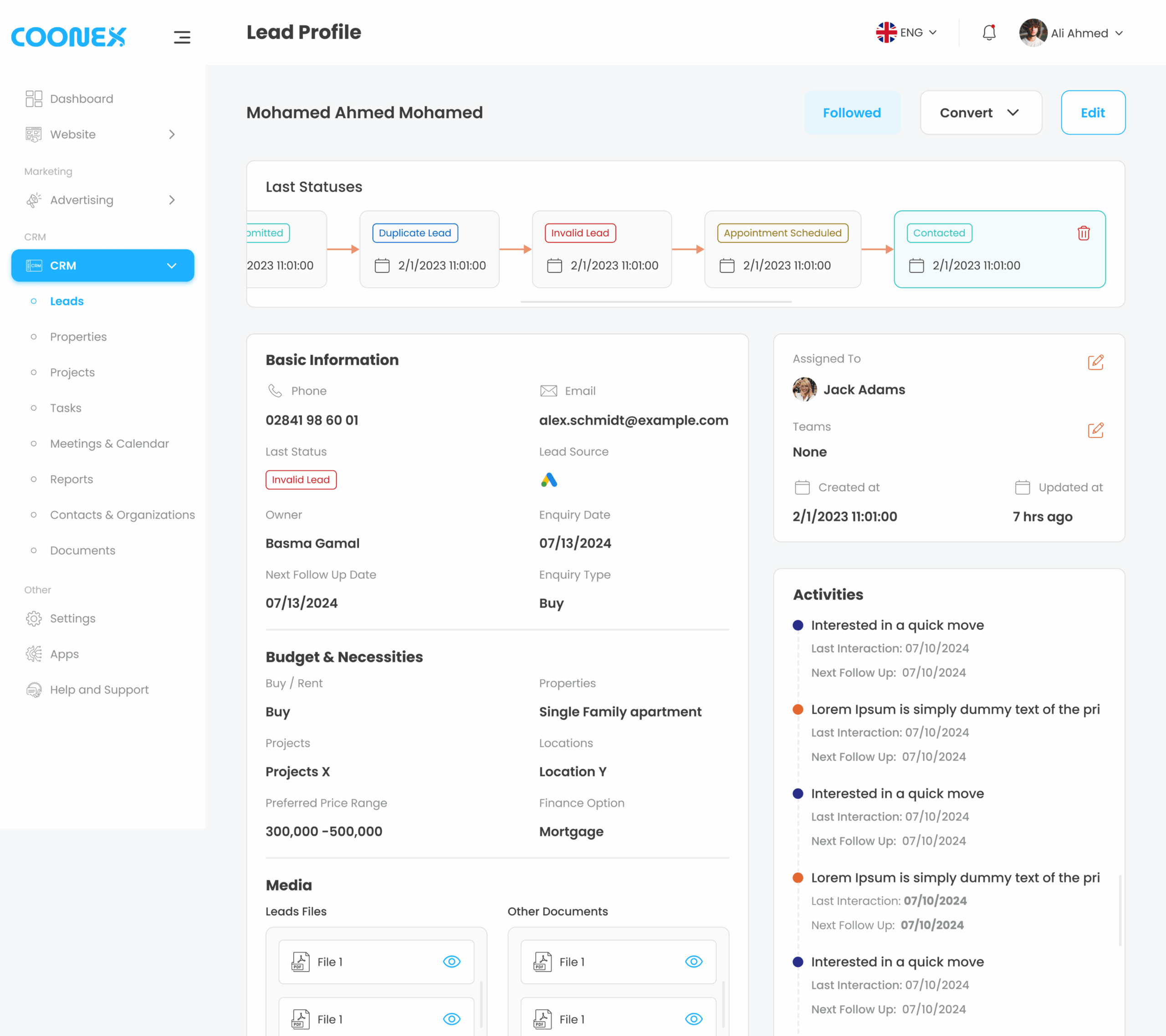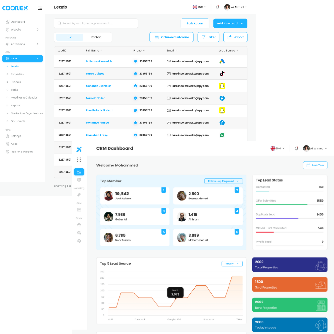 Manage every lead from first click to closing. Coonex CRM is designed specifically for real estate teams track conversations, follow up automatically, and never miss a sales opportunity again. Everything you need, all in one streamlined workspace.