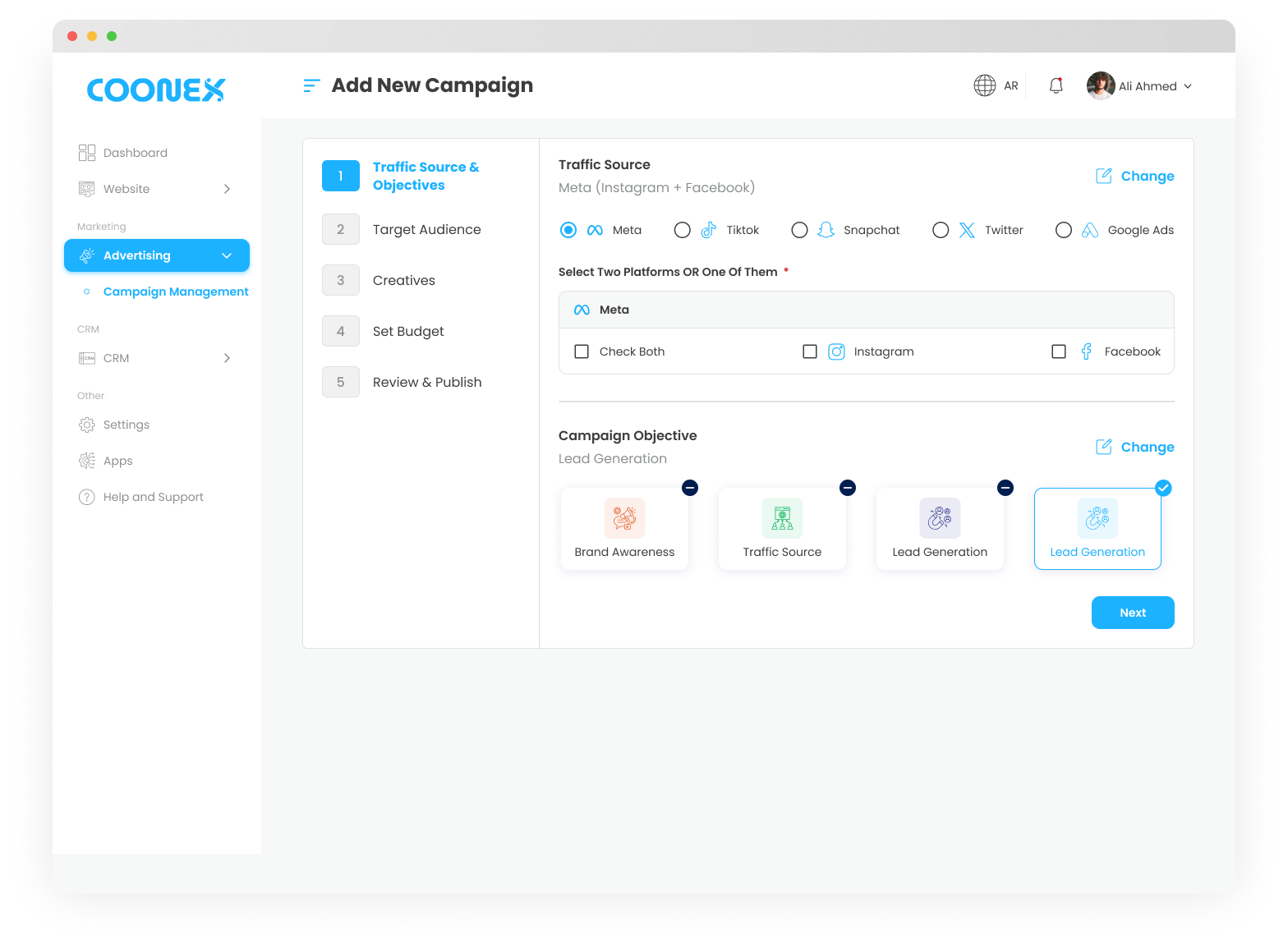 Coonex uses real-time data and AI to launch high-performance lead generation campaigns across Meta, TikTok, Snapchat, and Google—bringing qualified prospects directly into your CRM.
